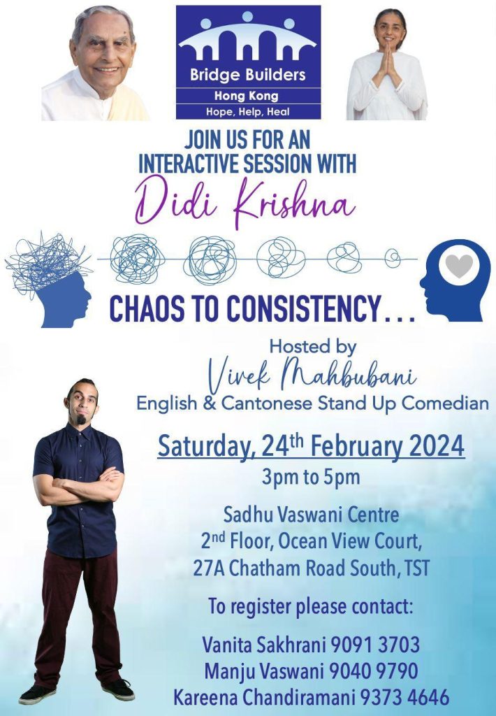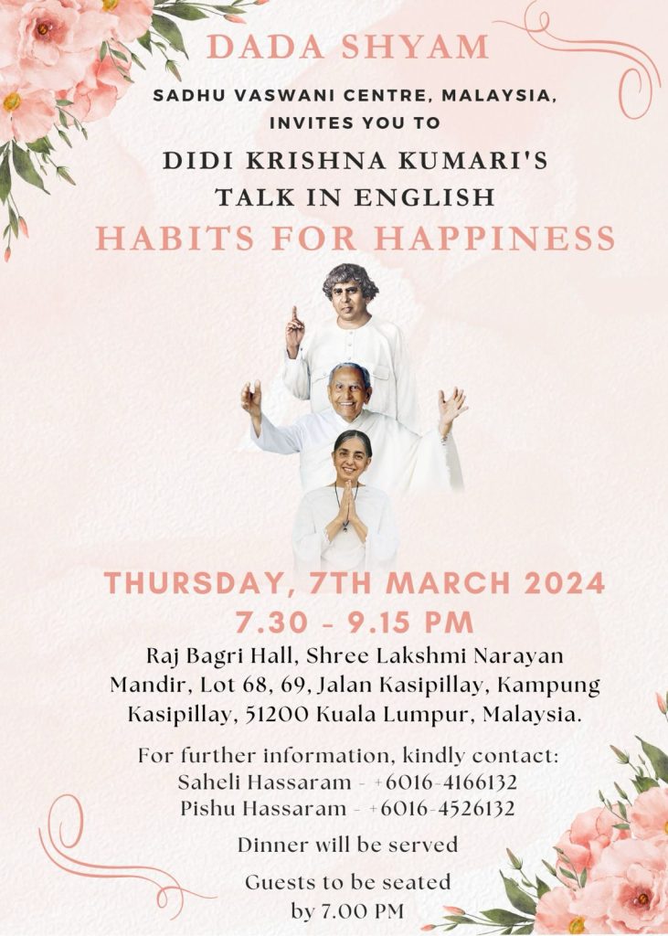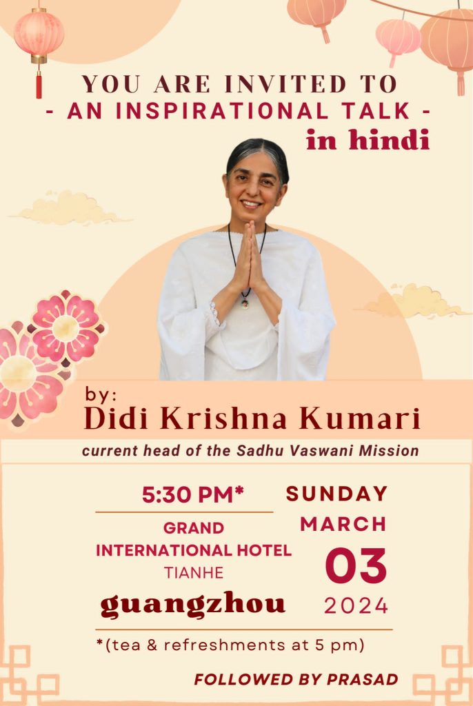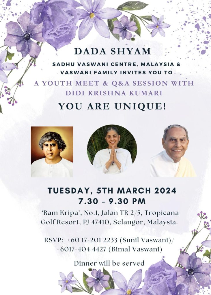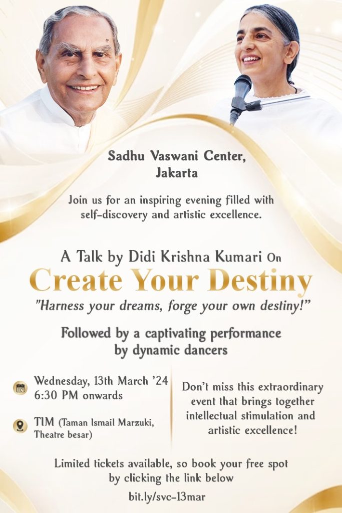 Guided by Didi Krishna Kumari as per the vision and steps laid out by beloved Dada, The Sadhu Vaswani Center for World Peace is more than an organization; it is a movement, a sanctuary for peace seekers, and a global community of kindred spirits. Together, we strive to make the world a better place—one act of forgiveness, one compassionate deed, and one moment of unity at a time. Join us in our journey towards a more peaceful and harmonious world, for together, we can be the change we wish to see in the world.