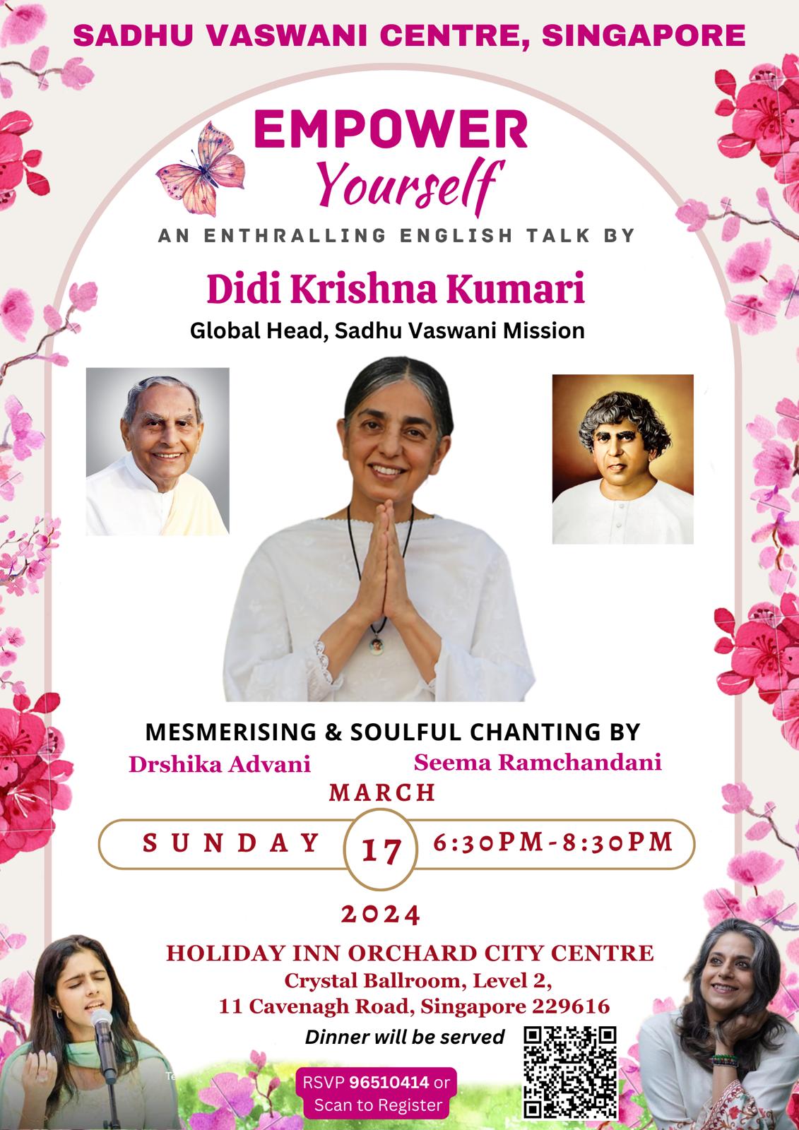 Empower Yourself - An Enthralling English Talk Empower Yourself - An Enthralling English Talk time : 06:30 pm to 08:30 pm Date : Sunday, 17th March 2024 Location : Holiday inn Orchard City Centre,, Crystal Ballroom, Level2, 11 Cavenagh Road, Singapore Registration - Please contact: Vanita Sakhrani 9091 3703 Manju Vaswani 9040 9790 Kareena Chandiramani 9373 4646