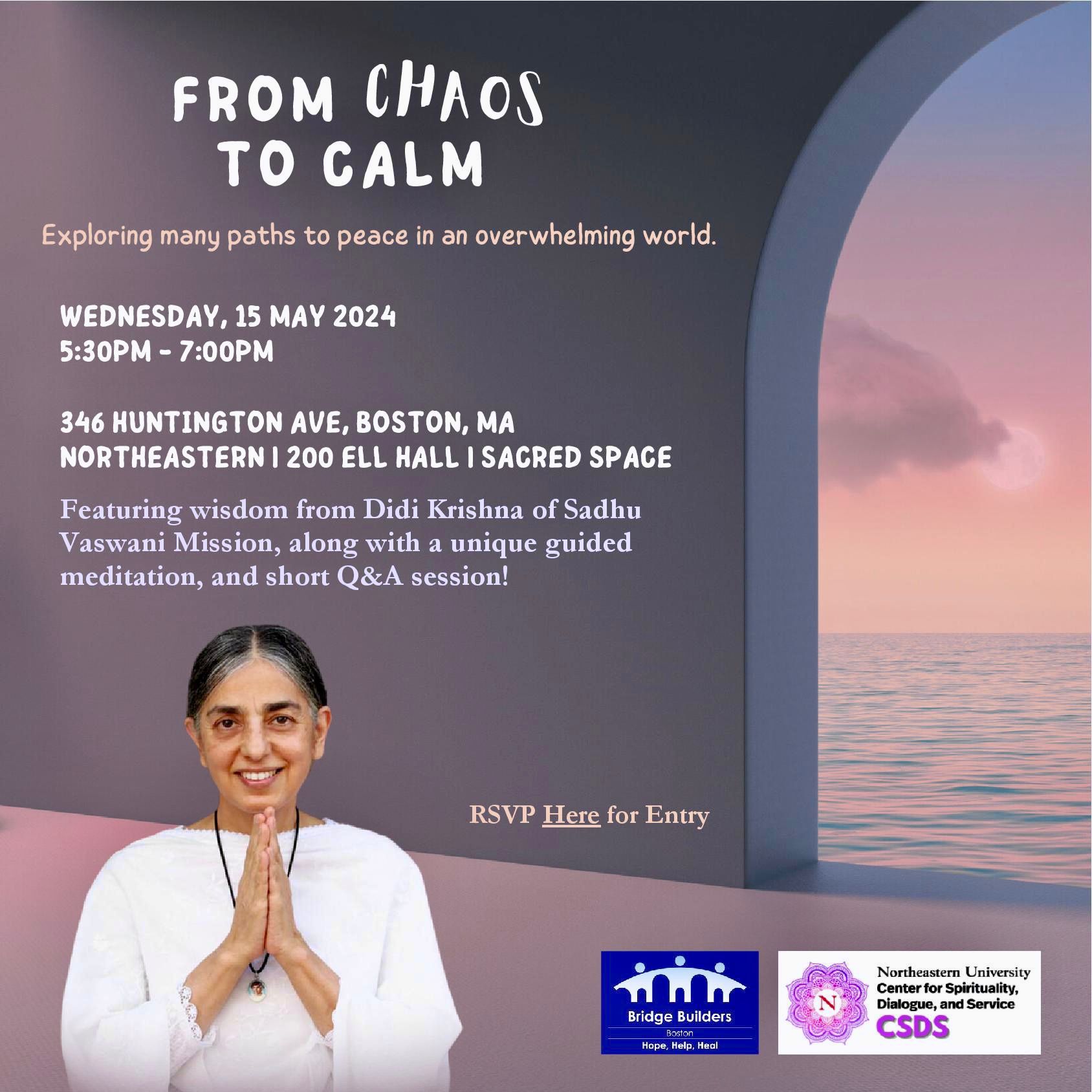 FROM CHAOS TO CALM WITH DIDI KRISHNA FROM CHAOS TO CALM WITH DIDI KRISHNA time : 5.30pm to 7.30pm Date : Wednesday, May 15, 2024 Location : 346 Huntington Ave, Boston, MA Northeastern 200 ELL Hall Sacred Space