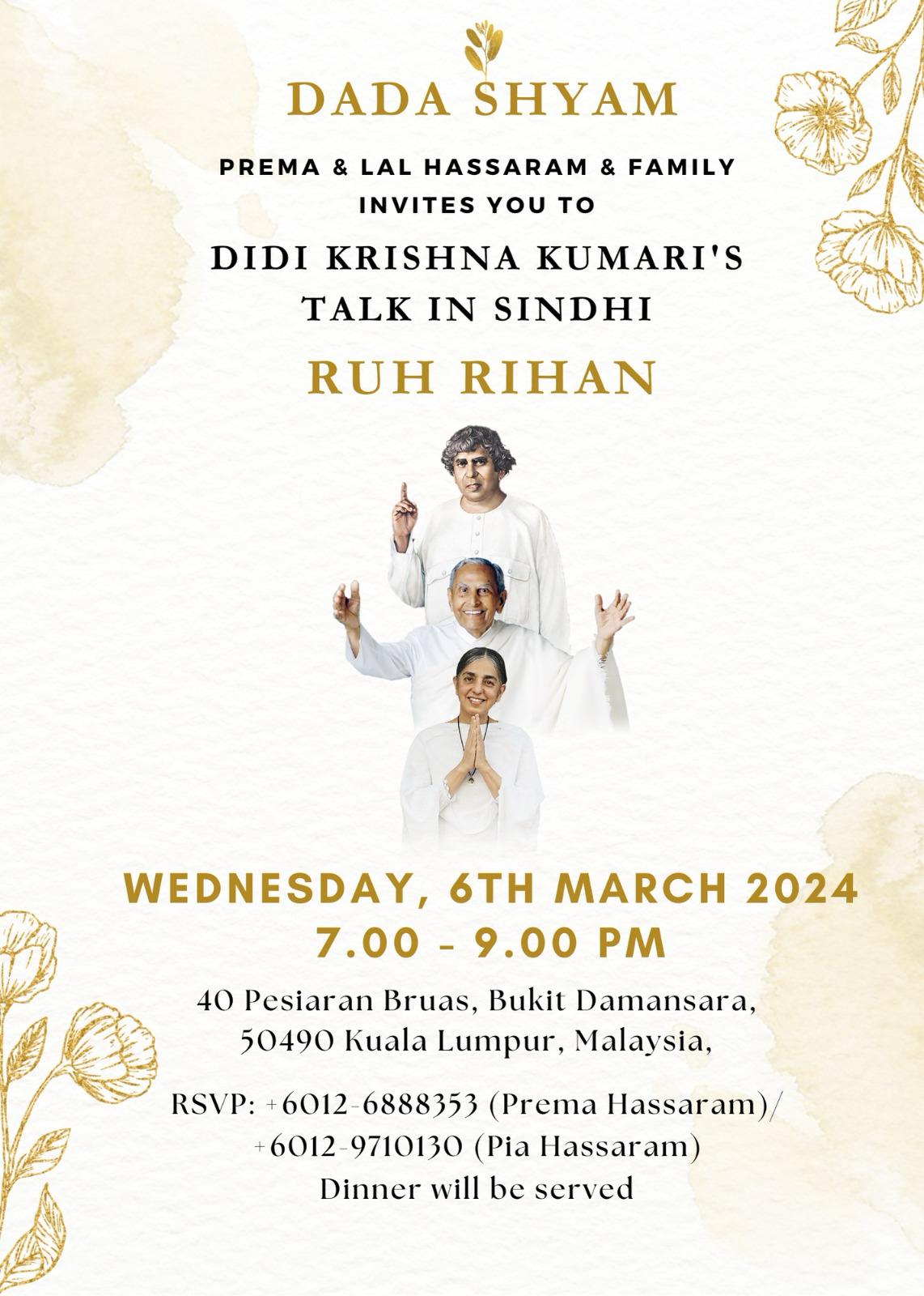 Ruh Rihan - A Talk In Sindhi Ruh Rihan - A Talk In Sindhi time : 7.00 - 9.00PM Date : WEDNESDAY, 6TH MARCH 2024 Location : 40 Pcsiaran Bruas, Bukit Damansara, 50490 Kuala Lumpur, Malaysia, Registration - Please contact: Prcma lassaram : 6012 6888353 Pia I lassaram: 6012 9710130