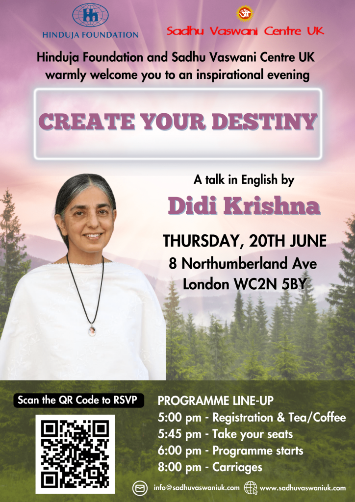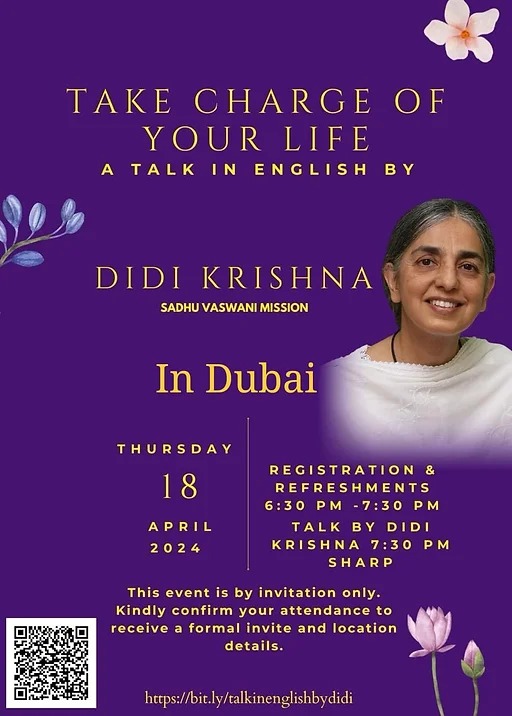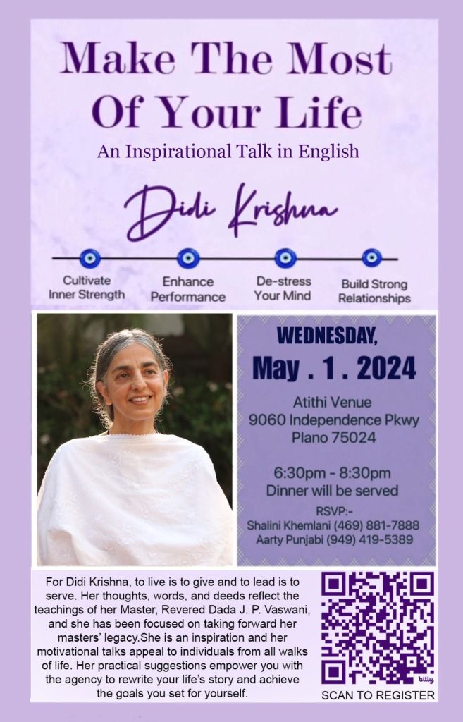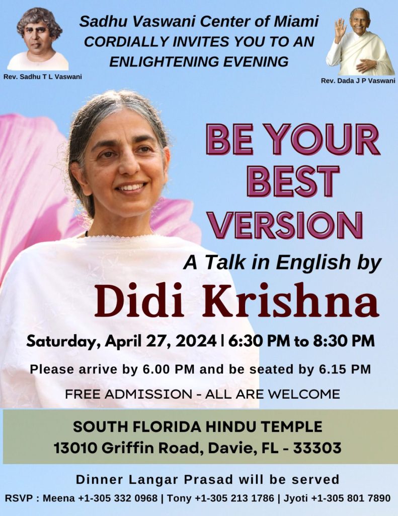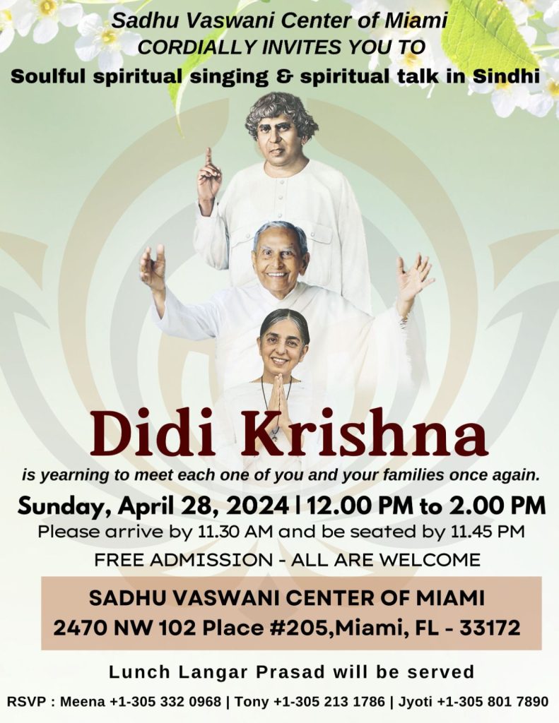 Didi Krishna, the head of the Sadhu Vaswani Mission, carries forward the work of her spiritual mentors, Sadhu T. L. Vaswani and beloved Dada (Dada J.P. Vaswani), by embarking on worldwide tours. These tours serve as a platform for Didi to share the teachings, wisdom, and principles that underpin the mission's work. They are an opportunity for individuals from diverse backgrounds to connect with her, learn from her profound insights, and be inspired to lead a life rooted in love and compassion. Below are all the details on Didi's West Tour 2024